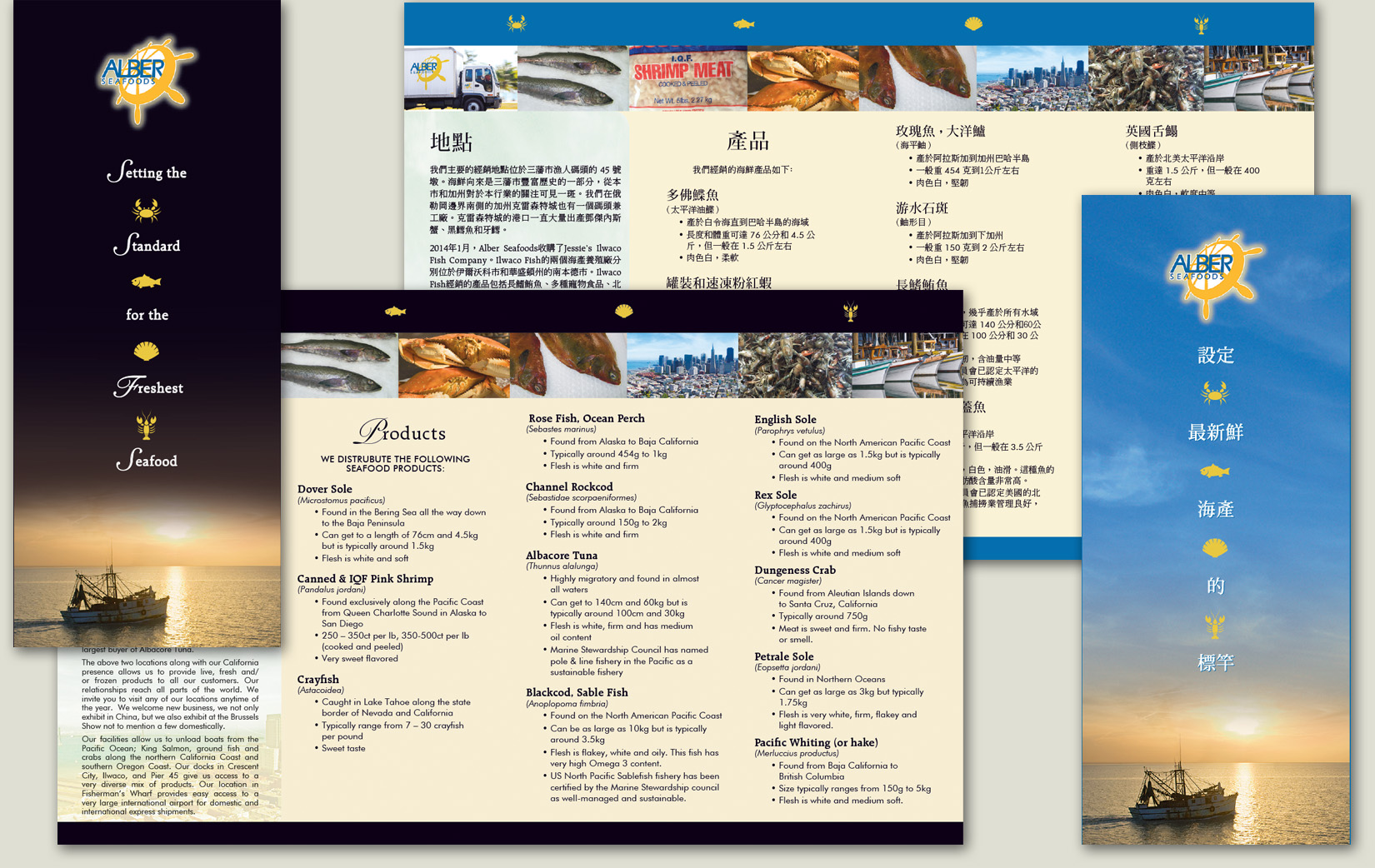 Alber Seafood's was established in 1995, and since then they have set the standard for the freshest products within the San Francisco Market. Alber Seafoods needed two brochures in different languages when they approached LaserCom Design. Keeping cultural references in mind, we chose colors that would work well together and created a contemporary design.